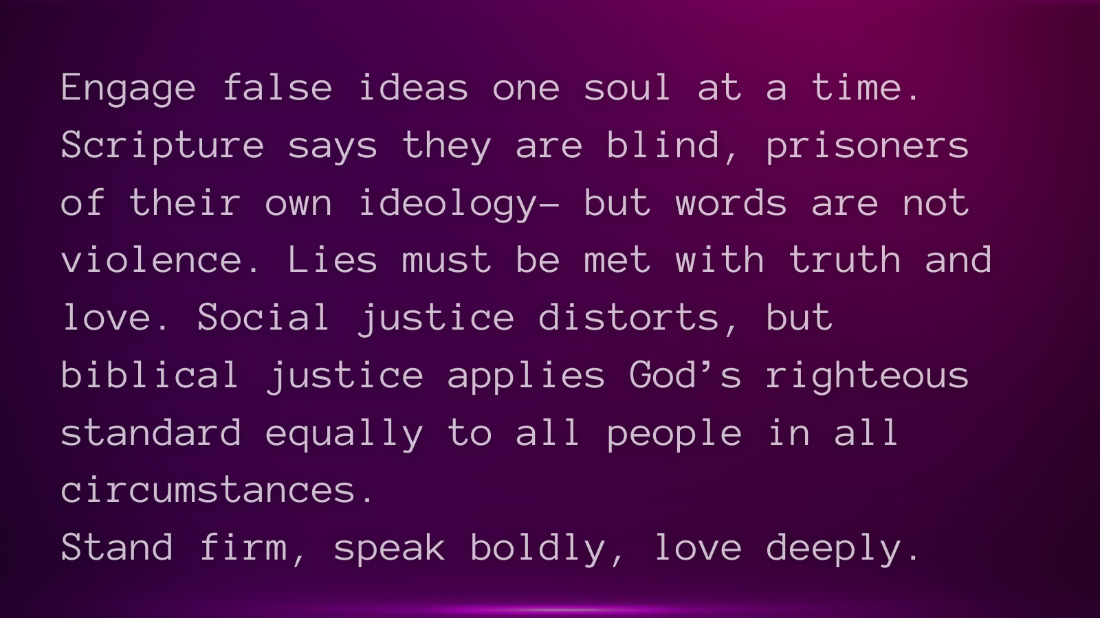 We do not call for a theocracy. We call for a return to the constitutional order of the United States as it was written and intended by the Founding Fathers, a system of limited government, equal justice under law, and ordered liberty underpinned by God’s eternal moral truth, not ruled by clerics or mobs. The Constitution presumes a moral people, accountable to a higher law than the state, where truth restrains power and law restrains passion. Biblical justice does not seek to replace civil government; it grounds it, ensuring that rights are unalienable, justice is impartial, and authority is exercised lawfully. This is not about imposing religion by force, it is about restoring the moral foundation without which no republic can endure.